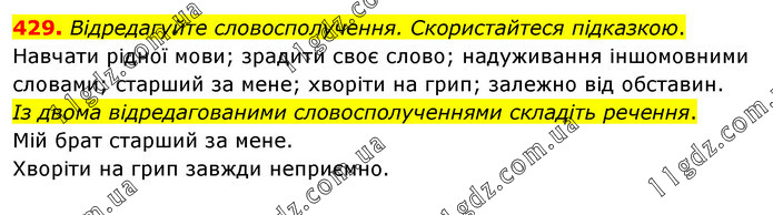 Відредагуйте словосполучення. Скористайтеся підказкою. Навчати рідної мови; зрадити своє слово; надуживання іншомовними словами; старший за мене; хворіти на грип; залежно від обставин. Із двома відредагованими словосполученнями складіть речення. Мій брат старший за мене. Хворіти на грип завжди неприємно.