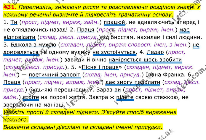 Перепишіть, знімаючи риски та розставляючи розділові знаки. У кожному реченні визначте й підкресліть граматичну основу. 1. Ти (прост, підмет, вираж, займ.) працюй, не вдивляючись вперед і не оглядаючись назад! 2. Праця (прост, підмет, вираж, імен.) має відповідати (склад, дієсл. присуд.) здібностям, нахилам і силі людини. 3. Бджола з мухою (складен, підмет, вираж словосп. імен, з імен.) не домовляться і в одному вулику не зустрінуться. 4. Ледар (прост, підмет, вираж, імен.) завжди й вічно наміряється щось зробити (склад, дієсл. присуд.). 5. «Пісня і праця» (складен, підмет, вираж. імен.) — поетичний заповіт (склад, імен, присуд.) Івана Франка. 6. Праця (прост, підмет, вираж, імен.) дає змогу подолати (склад, дієсл. присуд.) будь-які перешкоди. 7. Зараз ви (прост, підмет, вираж, займ.) стоїте на порозі життя. Завтра ж підете своєю стежкою, не звертаючи на манівці. Укажіть прості й складені підмети. З’ясуйте спосіб вираження кожного. Визначте складені дієслівні та складені іменні присудки.
