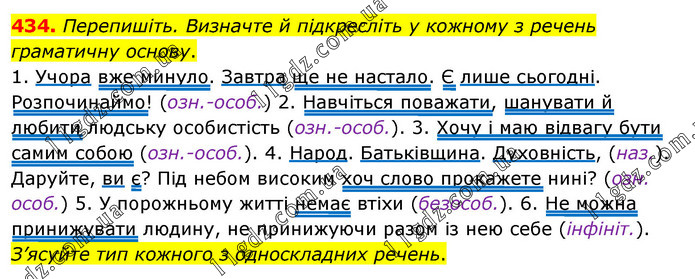 Перепишіть. Визначте й підкресліть у кожному з речень граматичну основу. 1. Учора вже минуло. Завтра ще не настало. Є лише сьогодні. Розпочинаймо! (озн.-особ.) 2. Навчіться поважати, шанувати й любити людську особистість (озн.-особ.). 3. Хочу і маю відвагу бути самим собою (озн.-особ.). 4. Народ. Батьківщина. Духовність, (наз.). Даруйте, ви є? Під небом високим хоч слово прокажете нині? (озн. особ.) 5. У порожньому житті немає втіхи (безособ.). 6. Не можна принижувати людину, не принижуючи разом із нею себе (інфініт.). З’ясуйте тип кожного з односкладних речень.