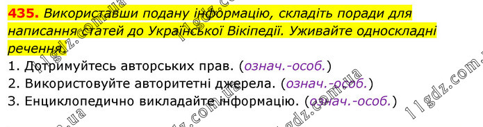 Використавши подану інформацію, складіть поради для написання статей до Української Вікіпедії. Уживайте односкладні речення. 1. Дотримуйтесь авторських прав. (означ.-особ.) 2. Використовуйте авторитетні джерела. (означ.-особ.) З. Енциклопедично викладайте інформацію. (означ.-особ.)
