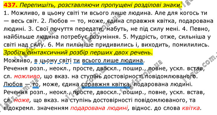 Перепишіть, розставляючи пропущені розділові знаки. 1. Можливо, в цьому світі ти всього лише людина. Але для когось ти — весь світ. 2. Любов — то, може, єдина справжня квітка, подарована людині. 3. Свої почуття передати, мабуть, не під силу мені. 4. Певно, найбільше людина потребує розуміння. 5. Мудрість, отже, сильніша у світі над силу. 6. Ми пильніше придивились і, виходить, помилились. Зробіть синтаксичний розбір перших двох речень. Можливо, в цьому світі ти всього лише людина. Речення розп., неокл., просте, двоскл., пошир., повне, ускл. встав, сл. можливо, що вказ. на ступінь достовірності повідомлюваного. Любов — то, може, єдина справжня квітка, подарована людині. Речення розп., неокл., просте, двоскл., пошир., повне, ускл. встав, сл. може, що вказ. на ступінь достовірності повідомлюваного, та відокремл. значенням подарована людині, віднос. до слова квітка.