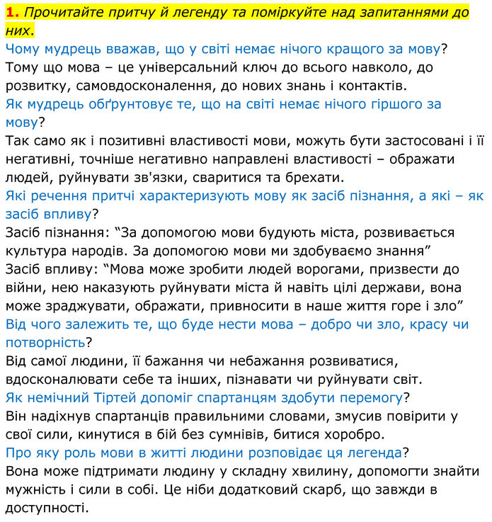 Прочитайте притчу й легенду та поміркуйте над запитаннями до них. Чому мудрець вважав, що у світі немає нічого кращого за мову? Тому що мова – це універсальний ключ до всього навколо, до розвитку, самовдосконалення, до нових знань і контактів. Як мудрець обґрунтовує те, що на світі немає нічого гіршого за мову? Так само як і позитивні властивості мови, можуть бути застосовані і її негативні, точніше негативно направлені властивості – ображати людей, руйнувати зв'язки, сваритися та брехати. Які речення притчі характеризують мову як засіб пізнання, а які – як засіб впливу? Засіб пізнання: “За допомогою мови будують міста, розвивається культура народів. За допомогою мови ми здобуваємо знання” Засіб впливу: “Мова може зробити людей ворогами, призвести до війни, нею наказують руйнувати міста й навіть цілі держави, вона може зраджувати, ображати, привносити в наше життя горе і зло” Від чого залежить те, що буде нести мова – добро чи зло, красу чи потворність? Від самої людини, її бажання чи небажання розвиватися, вдосконалювати себе та інших, пізнавати чи руйнувати світ. Як немічний Тіртей допоміг спартанцям здобути перемогу? Він надіхнув спартанців правильними словами, змусив повірити у свої сили, кинутися в бій без сумнівів, битися хоробро. Про яку роль мови в житті людини розповідає ця легенда? Вона може підтримати людину у складну хвилину, допомогти знайти мужність і сили в собі. Це ніби додатковий скарб, що завжди в доступності.