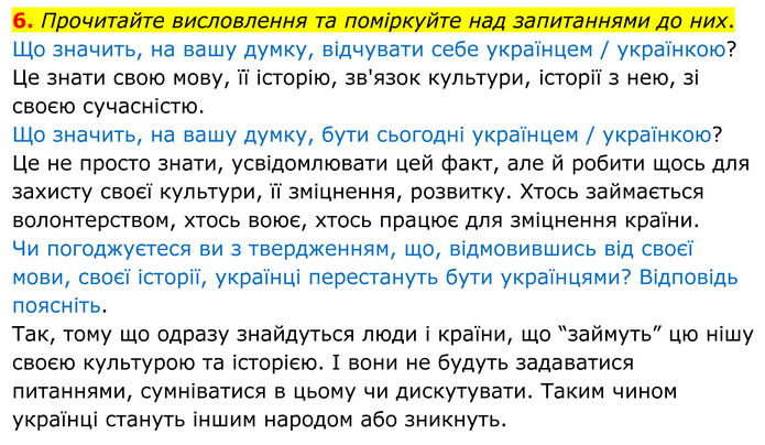 Прочитайте висловлення та поміркуйте над запитаннями до них. Що значить, на вашу думку, відчувати себе українцем / українкою? Це знати свою мову, її історію, зв'язок культури, історії з нею, зі своєю сучасністю. Що значить, на вашу думку, бути сьогодні українцем / українкою? Це не просто знати, усвідомлювати цей факт, але й робити щось для захисту своєї культури, її зміцнення, розвитку. Хтось займається волонтерством, хтось воює, хтось працює для зміцнення країни. Чи погоджуєтеся ви з твердженням, що, відмовившись від своєї мови, своєї історії, українці перестануть бути українцями? Відповідь поясніть. Так, тому що одразу знайдуться люди і країни, що “займуть” цю нішу своєю культурою та історією. І вони не будуть задаватися питаннями, сумніватися в цьому чи дискутувати. Таким чином українці стануть іншим народом або зникнуть.
