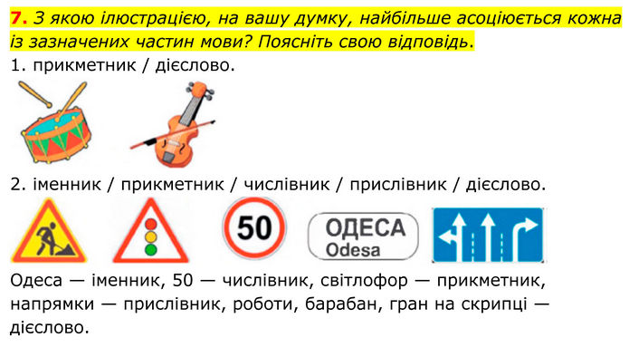 З якою ілюстрацією, на вашу думку, найбільше асоціюється кожна із зазначених частин мови? Поясніть свою відповідь. 1. прикметник / дієслово. 2. іменник / прикметник / числівник / прислівник / дієслово. Одеса — іменник, 50 — числівник, світлофор — прикметник, напрямки — прислівник, роботи, барабан, гран на скрипці — дієслово.