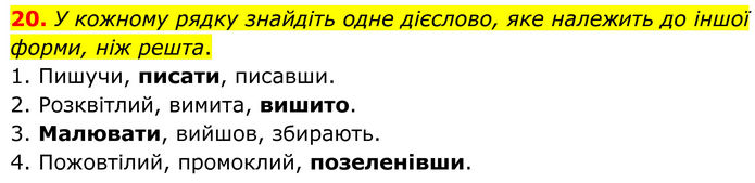 У кожному рядку знайдіть одне дієслово, яке належить до іншої форми, ніж решта. 1. Пишучи, писати, писавши. 2. Розквітлий, вимита, вишито. 3. Малювати, вийшов, збирають. 4. Пожовтілий, промоклий, позеленівши.