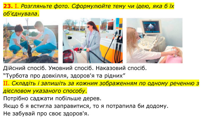 І. Розгляньте фото. Сформулюйте тему чи ідею, яка б їх об'єднувала. Дійсний спосіб. Умовний спосіб. Наказовий спосіб. “Турбота про довкілля, здоров'я та рідних” II. Складіть і запишіть за кожним зображенням по одному реченню з дієсловом указаного способу. Потрібно саджати побільше дерев. Якщо б я встигла заправитися, то я потрапила би додому. Не забувай про своє здоров'я.