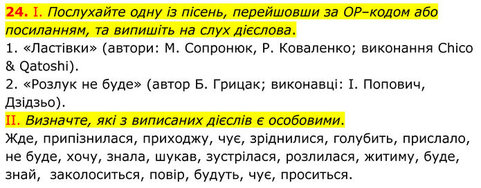 І. Послухайте одну із пісень, перейшовши за ОР–кодом або посиланням, та випишіть на слух дієслова. 1. «Ластівки» (автори: М. Сопронюк, Р. Коваленко; виконання Chico & Qatoshi). 2. «Розлук не буде» (автор Б. Грицак; виконавці: І. Попович, Дзідзьо). II. Визначте, які з виписаних дієслів є особовими. Жде, припізнилася, приходжу, чує, зріднилися, голубить, прислало, не буде, хочу, знала, шукав, зустрілася, розлилася, житиму, буде, знай, заколоситься, повір, будуть, чує, проситься.