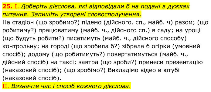 І. Доберіть дієслова, які відповідали б на подані в дужках питання. Запишіть утворені словосполучення. На стадіон (що зробимо?) підемо (дійсного. сп., майб. ч) разом; (що робитиму?) працюватиму (майб. ч., дійсного сп.) в саду; на уроці (що будуть робити?) писатимуть (майб. ч., дійсного способу) контрольну; на городі (що зробила б?) зібрала б огірки (умовний спосіб); додому (що робитимуть?) повертатимуться (майб. ч., дійсний спосіб) на таксі; завтра (що зроби?) принеси презентацію (наказовий спосіб); (що зробімо?) Викладімо відео в ютубі (наказовий спосіб). II. Визначте час і спосіб кожного дієслова.