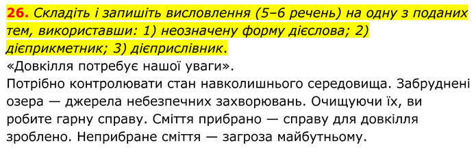 Складіть і запишіть висловлення (5–6 речень) на одну з поданих тем, використавши: 1) неозначену форму дієслова; 2) дієприкметник; 3) дієприслівник. «Довкілля потребує нашої уваги». Потрібно контролювати стан навколишнього середовища. Забруднені озера — джерела небезпечних захворювань. Очищуючи їх, ви робите гарну справу. Сміття прибрано — справу для довкілля зроблено. Неприбране сміття — загроза майбутньому.