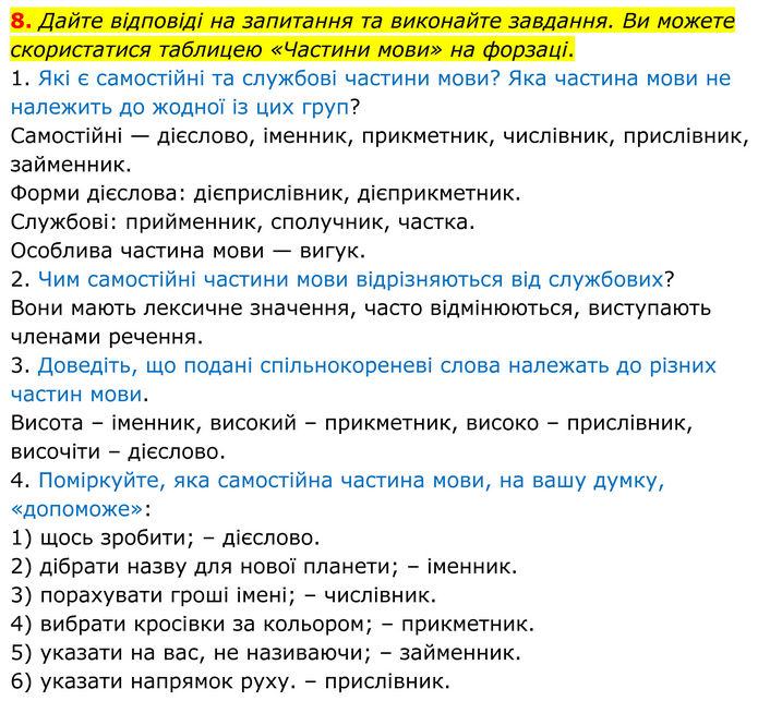 Дайте відповіді на запитання та виконайте завдання. Ви можете скористатися таблицею «Частини мови» на форзаці. 1. Які є самостійні та службові частини мови? Яка частина мови не належить до жодної із цих груп? Самостійні — дієслово, іменник, прикметник, числівник, прислівник, займенник. Форми дієслова: дієприслівник, дієприкметник. Службові: прийменник, сполучник, частка. Особлива частина мови — вигук. 2. Чим самостійні частини мови відрізняються від службових? Вони мають лексичне значення, часто відмінюються, виступають членами речення. 3. Доведіть, що подані спільнокореневі слова належать до різних частин мови. Висота – іменник, високий – прикметник, високо – прислівник, височіти – дієслово. 4. Поміркуйте, яка самостійна частина мови, на вашу думку, «допоможе»: 1) щось зробити; – дієслово. 2) дібрати назву для нової планети; – іменник. 3) порахувати гроші імені; – числівник. 4) вибрати кросівки за кольором; – прикметник. 5) указати на вас, не називаючи; – займенник. 6) указати напрямок руху. – прислівник.