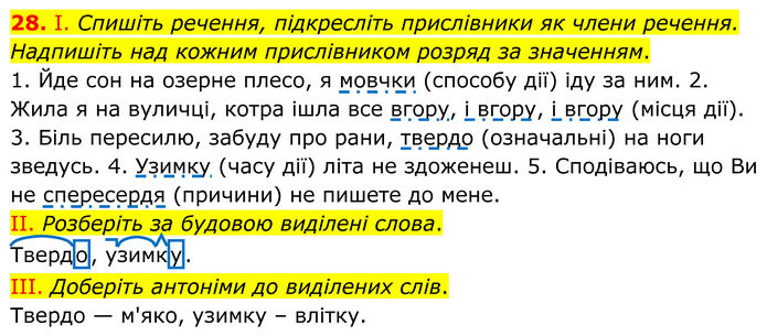 І. Спишіть речення, підкресліть прислівники як члени речення. Надпишіть над кожним прислівником розряд за значенням. 1. Йде сон на озерне плесо, я мовчки (способу дії) іду за ним. 2. Жила я на вуличці, котра ішла все вгору, і вгору, і вгору (місця дії). 3. Біль пересилю, забуду про рани, твердо (означальні) на ноги зведусь. 4. Узимку (часу дії) літа не здоженеш. 5. Сподіваюсь, що Ви не спересердя (причини) не пишете до мене. II. Розберіть за будовою виділені слова. Твердо, узимку. III. Доберіть антоніми до виділених слів. Твердо — м'яко, узимку – влітку.