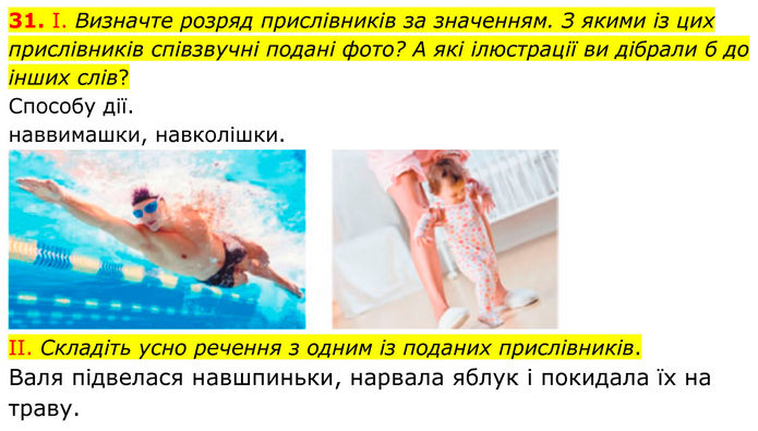 І. Визначте розряд прислівників за значенням. З якими із цих прислівників співзвучні подані фото? А які ілюстрації ви дібрали б до інших слів? Способу дії. наввимашки, навколішки. II. Складіть усно речення з одним із поданих прислівників. Валя підвелася навшпиньки, нарвала яблук і покидала їх на траву.