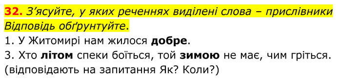 З’ясуйте, у яких реченнях виділені слова – прислівники Відповідь обґрунтуйте. 1. У Житомирі нам жилося добре. 3. Хто літом спеки боїться, той зимою не має, чим гріться. (відповідають на запитання Як? Коли?)