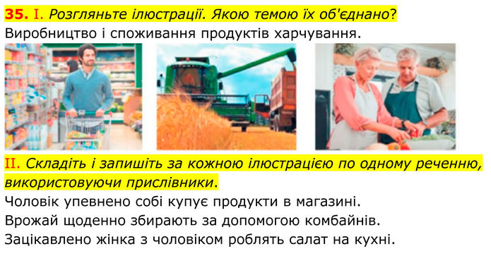 І. Розгляньте ілюстрації. Якою темою їх об'єднано? Виробництво і споживання продуктів харчування. II. Складіть і запишіть за кожною ілюстрацією по одному реченню, використовуючи прислівники. Чоловік упевнено собі купує продукти в магазині. Врожай щоденно збирають за допомогою комбайнів. Зацікавлено жінка з чоловіком роблять салат на кухні.