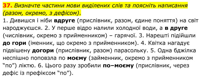 Визначте частини мови виділених слів та поясніть написання (разом, окремо, з дефісом). 1. Дивишся і ніби вдруге (прислівник, разом, єдине поняття) на світ народжуєшся. 2. У перше відро налили холодної води, а в друге (числівник, окремо з прийменником) – гарячої. 3. Нарешті підійшли до гори (іменник, що окремо з прийменником). 4. Квітка нагадує підвішену догори (прислівник, разом) парасольку. 5. Одна бджілка неспішно поповзла по моєму (займенник, окремо з прийменником “по”) ліктю. 6. Цього разу зробили по–моєму (прислівник, через дефіс із префіксом “по”).