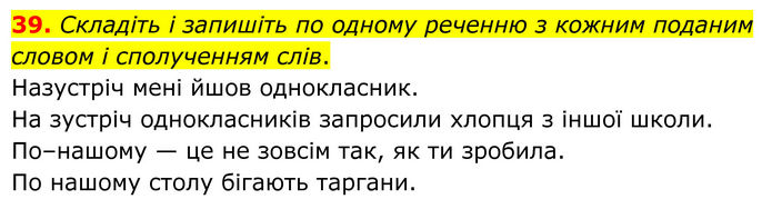 Складіть і запишіть по одному реченню з кожним поданим словом і сполученням слів. Назустріч мені йшов однокласник. На зустріч однокласників запросили хлопця з іншої школи. По–нашому — це не зовсім так, як ти зробила. По нашому столу бігають таргани.