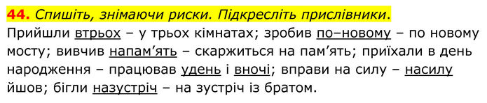 Спишіть, знімаючи риски. Підкресліть прислівники. Прийшли втрьох – у трьох кімнатах; зробив по–новому – по новому мосту; вивчив напам’ять – скаржиться на пам’ять; приїхали в день народження – працював удень і вночі; вправи на силу – насилу йшов; бігли назустріч – на зустріч із братом.