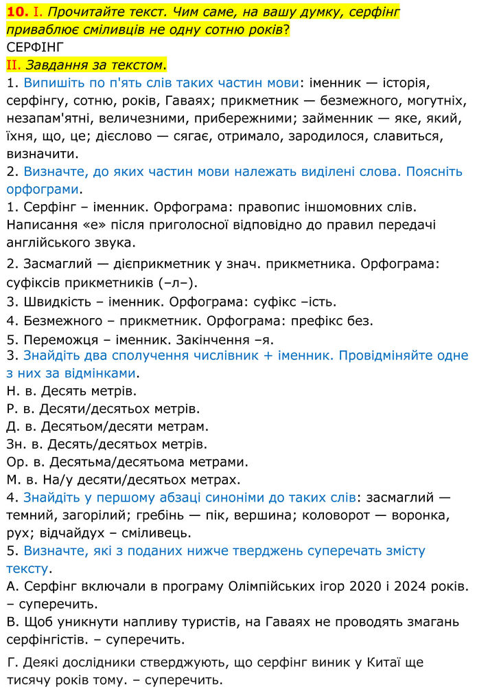 І. Прочитайте текст. Чим саме, на вашу думку, серфінг приваблює сміливців не одну сотню років? СЕРФІНГ II. Завдання за текстом. 1. Випишіть по п'ять слів таких частин мови: іменник — історія, серфінгу, сотню, років, Гаваях; прикметник — безмежного, могутніх, незапам'ятні, величезними, прибережними; займенник — яке, який, їхня, що, це; дієслово — сягає, отримало, зародилося, славиться, визначити. 2. Визначте, до яких частин мови належать виділені слова. Поясніть орфограми. 1. Серфінг – іменник. Орфограма: правопис іншомовних слів. Написання «е» після приголосної відповідно до правил передачі англійського звука. 2. Засмаглий — дієприкметник у знач. прикметника. Орфограма: суфіксів прикметників (–л–). 3. Швидкість – іменник. Орфограма: суфікс –ість. 4. Безмежного – прикметник. Орфограма: префікс без. 5. Переможця – іменник. Закінчення –я. 3. Знайдіть два сполучення числівник + іменник. Провідміняйте одне з них за відмінками. Н. в. Десять метрів. Р. в. Десяти/десятьох метрів. Д. в. Десятьом/десяти метрам. Зн. в. Десять/десятьох метрів. Ор. в. Десятьма/десятьома метрами. М. в. На/у десяти/десятьох метрах. 4. Знайдіть у першому абзаці синоніми до таких слів: засмаглий — темний, загорілий; гребінь — пік, вершина; коловорот — воронка, рух; відчайдух – сміливець. 5. Визначте, які з поданих нижче тверджень суперечать змісту тексту. А. Серфінг включали в програму Олімпійських ігор 2020 і 2024 років. – суперечить. В. Щоб уникнути напливу туристів, на Гаваях не проводять змагань серфінгістів. – суперечить. Г. Деякі дослідники стверджують, що серфінг виник у Китаї ще тисячу років тому. – суперечить.