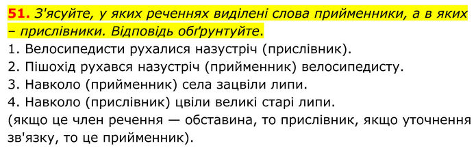 З'ясуйте, у яких реченнях виділені слова прийменники, а в яких – прислівники. Відповідь обґрунтуйте. 1. Велосипедисти рухалися назустріч (прислівник). 2. Пішохід рухався назустріч (прийменник) велосипедисту. 3. Навколо (прийменник) села зацвіли липи. 4. Навколо (прислівник) цвіли великі старі липи. (якщо це член речення — обставина, то прислівник, якщо уточнення зв'язку, то це прийменник).