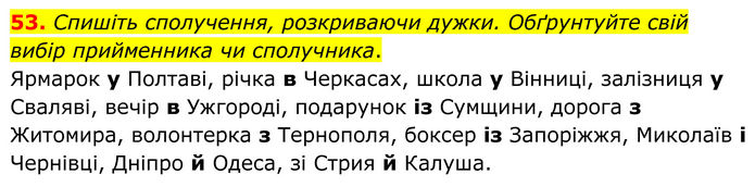Спишіть сполучення, розкриваючи дужки. Обґрунтуйте свій вибір прийменника чи сполучника. Ярмарок у Полтаві, річка в Черкасах, школа у Вінниці, залізниця у Сваляві, вечір в Ужгороді, подарунок із Сумщини, дорога з Житомира, волонтерка з Тернополя, боксер із Запоріжжя, Миколаїв і Чернівці, Дніпро й Одеса, зі Стрия й Калуша.