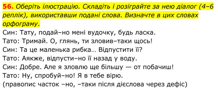Оберіть ілюстрацію. Складіть і розіграйте за нею діалог (4–6 реплік), використавши подані слова. Визначте в цих словах орфограму. Син: Тату, подай–но мені вудочку, будь ласка. Тато: Тримай. О, глянь, ти зловив–таки щось! Син: Та це маленька рибка… Відпустити її? Тато: Аякже, відпусти–но її назад у воду. Син: Добре. Але я зловлю ще більшу — от побачиш! Тато: Ну, спробуй–но! Я в тебе вірю. (правопис часток –но, –таки після дієслова через дефіс)