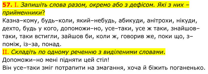 І. Запишіть слова разом, окремо або з дефісом. Які з них – прийменники? Казна–кому, будь–коли, який–небудь, абикуди, анітрохи, нікуди, дехто, будь у кого, допоможи–но, усе–таки, усе ж таки, знайшов–таки, таки встигли, зайшов би, коли ж, говорив же, поки що, з–поміж, із–за, понад. II. Складіть по одному реченню з виділеними словами. Допоможи–но мені підняти цей стіл! Він усе–таки зміг потрапити на змагання, хоча й біжить поганенько.