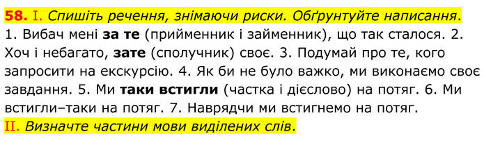 І. Спишіть речення, знімаючи риски. Обґрунтуйте написання. 1. Вибач мені за те (прийменник і займенник), що так сталося. 2. Хоч і небагато, зате (сполучник) своє. 3. Подумай про те, кого запросити на екскурсію. 4. Як би не було важко, ми виконаємо своє завдання. 5. Ми таки встигли (частка і дієслово) на потяг. 6. Ми встигли–таки на потяг. 7. Наврядчи ми встигнемо на потяг. II. Визначте частини мови виділених слів.