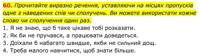 Прочитайте виразно речення, уставляючи на місцях пропусків одне з наведених спів чи сполучень. Ви можете використати кожне слово чи сполучення один раз. 1. Я не знаю, що б таке цікаве тобі розказати. 2. Як би не пручався, а працювати доведеться. 3. Доїхали б набагато швидше, якби не сильний дощ. 4. Треба малого навчитися, щоб знати більше.