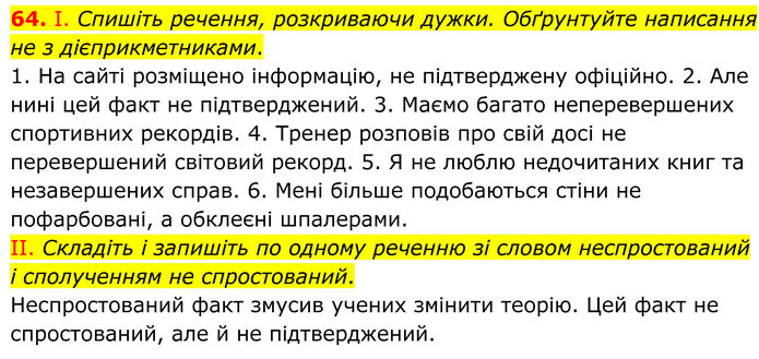 І. Спишіть речення, розкриваючи дужки. Обґрунтуйте написання не з дієприкметниками. 1. На сайті розміщено інформацію, не підтверджену офіційно. 2. Але нині цей факт не підтверджений. 3. Маємо багато неперевершених спортивних рекордів. 4. Тренер розповів про свій досі не перевершений світовий рекорд. 5. Я не люблю недочитаних книг та незавершених справ. 6. Мені більше подобаються стіни не пофарбовані, а обклеєні шпалерами. II. Складіть і запишіть по одному реченню зі словом неспростований і сполученням не спростований. Неспростований факт змусив учених змінити теорію. Цей факт не спростований, але й не підтверджений.