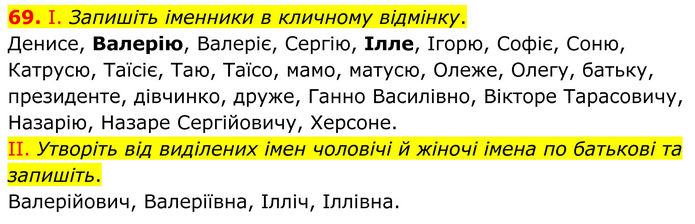 І. Запишіть іменники в кличному відмінку. Денисе, Валерію, Валеріє, Сергію, Ілле, Ігорю, Софіє, Соню, Катрусю, Таїсіє, Таю, Таїсо, мамо, матусю, Олеже, Олегу, батьку, президенте, дівчинко, друже, Ганно Василівно, Вікторе Тарасовичу, Назарію, Назаре Сергійовичу, Херсоне. ІІ. Утворіть від виділених імен чоловічі й жіночі імена по батькові та запишіть. Валерійович, Валеріївна, Ілліч, Іллівна.