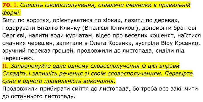 І. Спишіть словосполучення, ставлячи іменники в правильній формі. Бити по воротах, орієнтуватися по зірках, лазити по деревах, подарувати Віталію Кличку (Віталієві Кличкові), допомогти брат ові Сергієві, налити води курчатам, відео про веселих кошенят, наїстися смачних черешен, запитали в Олега Косенка, зустріли Віру Косенко, зручний переказ грошей, продовжили до листопада, сиділи під черешнею. II. Запропонуйте одне одному словосполучення із цієї вправи Складіть і запишіть речення зі своїм словосполученням. Перевірте одне в одного правильність виконання. Продовжили прибирати сміття до листопада, бо треба все закінчити до останнього листопаду.