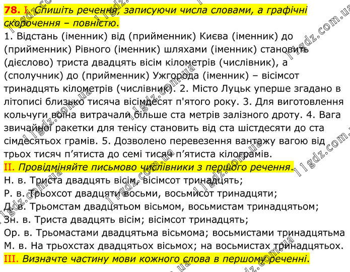 І. Спишіть речення, записуючи числа словами, а графічні скорочення – повністю. 1. Відстань (іменник) від (прийменник) Києва (іменник) до (прийменник) Рівного (іменник) шляхами (іменник) становить (дієслово) триста двадцять вісім кілометрів (числівник), а (сполучник) до (прийменник) Ужгорода (іменник) – вісімсот тринадцять кілометрів (числівник). 2. Місто Луцьк уперше згадано в літописі близько тисяча вісімдесят п'ятого року. 3. Для виготовлення кольчуги воїна витрачали більше ста метрів залізного дроту. 4. Вага звичайної ракетки для тенісу становить від ста шістдесяти до ста сімдесятьох грамів. 5. Дозволено перевезення вантажу вагою від трьох тисяч п’ятиста до семі тисяч п’ятиста кілограмів. II. Провідміняйте письмово числівники з першого речення. Н. в. Триста двадцять вісім, вісімсот тринадцять; Р. в. Трьохсот двадцяти восьми, восьмисот тринадцяти; Д. в. Трьомстам двадцятьом вісьмом, восьмистам тринадцятьом; Зн. в. Триста двадцять вісім; вісімсот тринадцять; Ор. в. Трьомастами двадцятьма вісьмома; восьмистами тринадцятьма М. в. На трьохстах двадцятьох вісьмох; на восьмистах тринадцятьох. III. Визначте частину мови кожного слова в першому реченні.