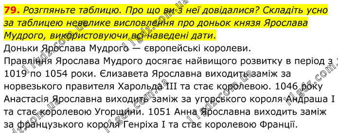 Розгпяньте таблицю. Про що ви з неї довідалися? Складіть усно за таблицею невелике висловлення про доньок князя Ярослава Мудрого, використовуючи всі наведені дати. Доньки Ярослава Мудрого — європейські королеви. Правління Ярослава Мудрого досягає найвищого розвитку в період з 1019 по 1054 роки. Єлизавета Ярославна виходить заміж за норвезького правителя Харольда ІІІ та стає королевою. 1046 року Анастасія Ярославна виходить заміж за угорського короля Андраша І та стає королевою Угорщини. 1051 Анна Ярославна виходить заміж за французького короля Генріха І та стає королевою Франції.