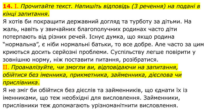 І. Прочитайте текст. Напишіть відповідь (3 речення) на подані в кінці запитання. Я хотів би покращити державний догляд та турботу за дітьми. На жаль, навіть у звичайних благополучних родинах часто діти потерпають від різних речей. Існує думка, що якщо родина “нормальна”, є ніби нормальні батьки, то все добре. Але часто за цим криються досить серйозні проблеми. Суспільству легше повірити у зовнішню норму, ніж поставити питання, розібратися. II. Проаналізуйте, чи змогли ви, відповідаючи на запитання, обійтися без іменника, прикметника, займенника, дієслова чи прислівника. Я не зміг би обійтися без дієслів та займенників, що єднати їх із іменниками, що теж необхідні для висловлення. Займенники, прислівники теж допомагають урізноманітнити висловлення.