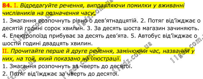 І. Відредагуйте речення, виправляючи помилки у вживанні числівників на позначення часу. 1. Змагання розпочнуть рівно о дев’ятнадцятій. 2. Потяг від’їжджає о десятій годині сорок хвилин. 3. За десять шоста магазин зачиняють. 4. Електропоїзд прибуває за десять дев’ята. 5. Автобус від’їжджає о шостій годині двадцять хвилин. II. Прочитайте перше й друге речення, замінюючи час, названий у них, на той, який показано на ілюстрації. 1. Змагання розпочнуть за чверть до десятої. 2. Потяг від'їжджає за чверть до десятої.