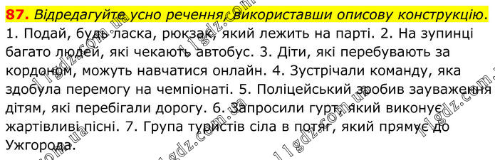 Відредагуйте усно речення, використавши описову конструкцію. 1. Подай, будь ласка, рюкзак, який лежить на парті. 2. На зупинці багато людей, які чекають автобус. 3. Діти, які перебувають за кордоном, можуть навчатися онлайн. 4. Зустрічали команду, яка здобула перемогу на чемпіонаті. 5. Поліцейський зробив зауваження дітям, які перебігали дорогу. 6. Запросили гурт, який виконує жартівливі пісні. 7. Група туристів сіла в потяг, який прямує до Ужгорода.