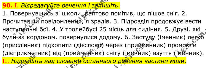 І. Відредагуйте речення і запишіть. 1. Повернувшись зі школи, раптово помітив, що пішов сніг. 2. Прочитавши повідомлення, я зрадів. 3. Підрозділ продовжує вести наступальні бої. 4. У тролейбусі 25 місць для сидіння. 5. Друзі, які були за кордоном, повернулися додому. 6. Застуду (іменник) легко (прислівник) підхопити (дієслово) через (прийменник) промокле (дієприкметник) від (прийменник) снігу (іменник) взуття (іменник). II. Надпишіть над словами останнього речення частини мови.