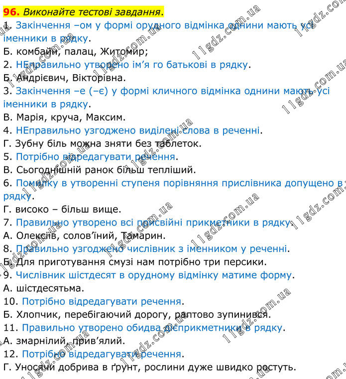 Виконайте тестові завдання. 1. Закінчення –ом у формі орудного відмінка однини мають усі іменники в рядку. Б. комбайн, палац, Житомир; 2. НЕправильно утворено ім’я го батькові в рядку. Б. Андрієвич, Вікторівна. 3. Закінчення –е (–є) у формі кличного відмінка однини мають усі іменники в рядку. В. Марія, круча, Максим. 4. НЕправильно узгоджено виділені слова в реченні. Г. Зубну біль можна зняти без таблеток. 5. Потрібно відредагувати речення. В. Сьогоднішній ранок більш тепліший. 6. Помилку в утворенні ступеня порівняння прислівника допущено в рядку. Г. високо – більш вище. 7. Правильно утворено всі присвійні прикметники в рядку. А. Олексіїв, солов’їний, Тамарин. 8. Правильно узгоджено числівник з іменником у реченні. Б. Для приготування смузі нам потрібно три персики. 9. Числівник шістдесят в орудному відмінку матиме форму. А. шістдесятьма. 10. Потрібно відредагувати речення. Б. Хлопчик, перебігаючий дорогу, раптово зупинився. 11. Правильно утворено обидва дієприкметники в рядку. А. змарнілий, прив’ялий. 12. Потрібно відредагувати речення. Г. Уносячи добрива в ґрунт, рослини дуже швидко ростуть.