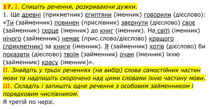 І. Спишіть речення, розкриваючи дужки. 1. Ще древні (прикметник) єгиптяни (іменник) говорили (дієслово): «Ти (займенник) повинен (прислівник) звернути (дієслово) своє (займенник) серце (іменник) до книг (іменник). На світі (іменник) нічого (займенник) немає (прис.слово/дієслово) кращого (прикметник) за книги (іменник). Я (займенник) хотів (дієслово) би показати (дієслово) твоїм (займенник) очам (іменник) їхню (займенник) красу (іменник)». II. Знайдіть у трьох реченнях (на вибір) слова самостійних частин мови та надпишіть скорочено над цими словами їхню частину мови. III. Складіть і запишіть одне речення з особовим займенником і порядковим числівником. Я третій по черзі.
