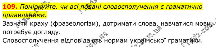 109. Поміркуйте, чи всі подані словосполучення є граматично правильними. Зазнати краху (фразеологізм), дотримати слова, навчатися мови, потребує догляду. Словосполучення відповідають нормам української граматики.