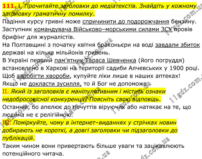 111. І. Прочитайте заголовки до медіатекстів. Знайдіть у кожному заголовку граматичну помилку. Падіння курсу гривні може спричинити до подорожчання бензину. Заступник командувача Військово–морськими силами ЗСУ провів брифінг для журналістів. На Полтавщині з початку квітня браконьєри на воді завдали збиток державі на кілька мільйонів гривень. В Україні перший пам’ятник Тараса Шевченка (його погруддя) встановлено в Харкові на території садиби Алчевських у 1900 році. Щоб запобігти хвороби, купуйте ліки лише в наших аптеках! Якщо не докласти зусилля, то й Бог не допоможе. II. Який із заголовків є маніпулятивним і містить ознаки недобросовісної конкуренції? Поясніть свою відповідь. Останній, бо апелює до почуттів віруючих або натякає на те, що людина не є релігійною. III. Поміркуйте, чому в інтернет–виданнях у стрічках новин добирають не короткі, а довгі заголовки чи підзаголовки до публікацій. Таким чином вони привертають більше уваги та зацікавлюють потенційного читача.