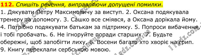 112. Спишіть речення, виправляючи допущені помилки. 1. Дякувати Петру Максимовичу за виступ. 2. Оксана подякувала тренеру за допомогу. 3. Сашко все сміявся, а Оксана дорікала йому. 4. Потрібно подякувати батькам за підтримку. 5. Попроси вибачення, і тобі пробачать. 6. Не ігноруйте поради старших. 7. Будьте обережні, щоб запобігти лиху. 8. Восени багато хто хворіє на грип. 9. Книгу переклали сербською мовою.