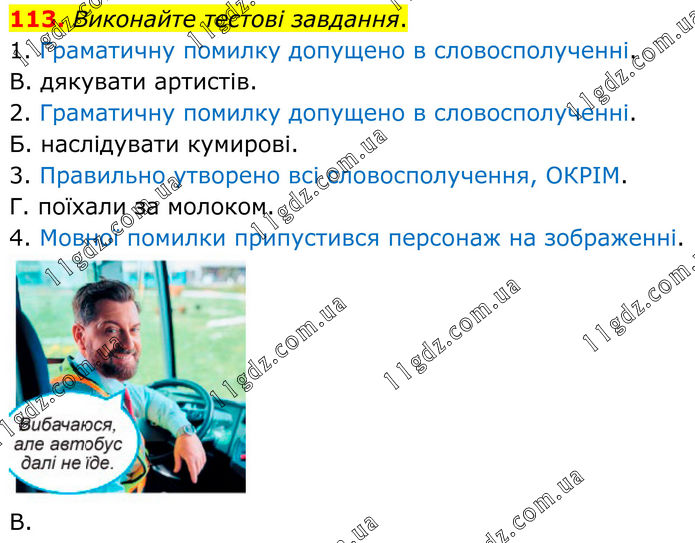 113. Виконайте тестові завдання. 1. Граматичну помилку допущено в словосполученні. В. дякувати артистів. 2. Граматичну помилку допущено в словосполученні. Б. наслідувати кумирові. 3. Правильно утворено всі словосполучення, ОКРІМ. Г. поїхали за молоком. 4. Мовної помилки припустився персонаж на зображенні. В.