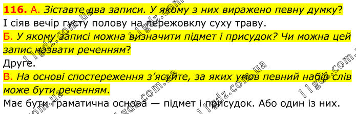 116. А. Зіставте два записи. У якому з них виражено певну думку? І сіяв вечір густу полову на пережовклу суху траву. Б. У якому записі можна визначити підмет і присудок? Чи можна цей запис назвати реченням? Друге. В. На основі спостереження з’ясуйте, за яких умов певний набір слів може бути реченням. Має бути граматична основа — підмет і присудок. Або один із них.