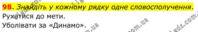 Знайдіть у кожному рядку одне словосполучення. Рухатися до мети. Уболівати за «Динамо».