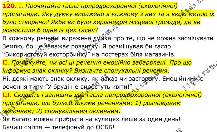 120. І. Прочитайте гасла природоохоронної (екологічної) пропаганди. Яку думку виражено в кожному з них та з якою метою їх було створено? Якби ви були керівником місцевої громади, де ви розмістили б одне із цих гасел? В кожному реченні виражена думка про те, що не можна засмічувати Землю, бо це заважає розвитку. Я розміщував би гасло “Використовуй екоторбинку” на постерах біля магазинів. II. Поміркуйте, чи всі ці речення емоційно забарвлені. Про що інформує знак оклику? Визначте спонукальні речення. Ні, деякі мають знак оклику, як наказ чи засторогу. Емоційними є речення типу ”У бруді не виростуть квіти!” III. Складіть і запишіть два гасла природоохоронної (екологічної) пропаганди, що були б такими реченнями: 1) розповідним окличним; 2) спонукальним окличним. Як багато можна прибрати на вулицях лише за один день! Бачиш сміття — телефонуй до ОСББ!
