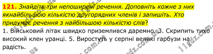 121. Знайдіть три непоширені речення. Доповніть кожне з них якнайбільшою кількістю другорядних членів і запишіть. Хто придумає речення з найбільшою кількістю слів? 1. Військовий літак швидко приземлився даремно. 3. Скрипить тихо високий клен уранці. 5. Виростуть у серпні великі гарбузи на радість.