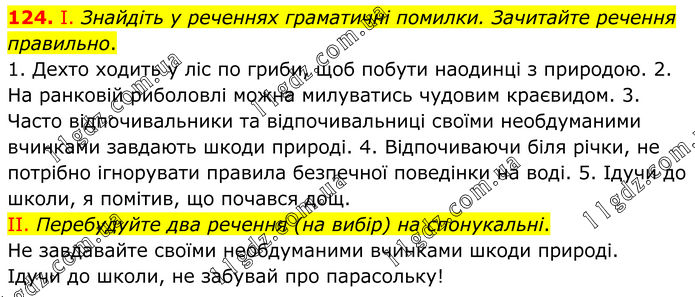 124. І. Знайдіть у реченнях граматичні помилки. Зачитайте речення правильно. 1. Дехто ходить у ліс по гриби, щоб побути наодинці з природою. 2. На ранковій риболовлі можна милуватись чудовим краєвидом. 3. Часто відпочивальники та відпочивальниці своїми необдуманими вчинками завдають шкоди природі. 4. Відпочиваючи біля річки, не потрібно ігнорувати правила безпечної поведінки на воді. 5. Ідучи до школи, я помітив, що почався дощ. II. Перебудуйте два речення (на вибір) на спонукальні. Не завдавайте своїми необдуманими вчинками шкоди природі. Ідучи до школи, не забувай про парасольку!