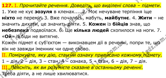 127. І. Прочитайте речення. Доведіть, що виділені слова – підмети. 1. Уже не кує зозуля в кленах.... 2. Моє нечуване терпіння іще ніхто не переміг. 3. Вже почалось, мабуть, майбутнє. 4. Жити – не значить дихати, це значить діяти. 5. Кожен із бійців знав, що небезпека подвоїлася. 6. Ще кілька людей схопилося на ноги. 7. «Ой» із біди не витягне. Кожен підмет є суб'єктом — виконавцем дії в реченні, попри те, що він не завжди іменник чи одне слово. II. Поміркуйте, яку дію, стан чи ознаку приписано кожному підмету. 1 – дія, 2 – дія, 3 – стан, 4 – ознака, 5 – стан, 6 – дія, 7 – дія. III. Поясніть, як ви розумієте сказане в останньому реченні. Треба діяти, а не лише хвилюватися.