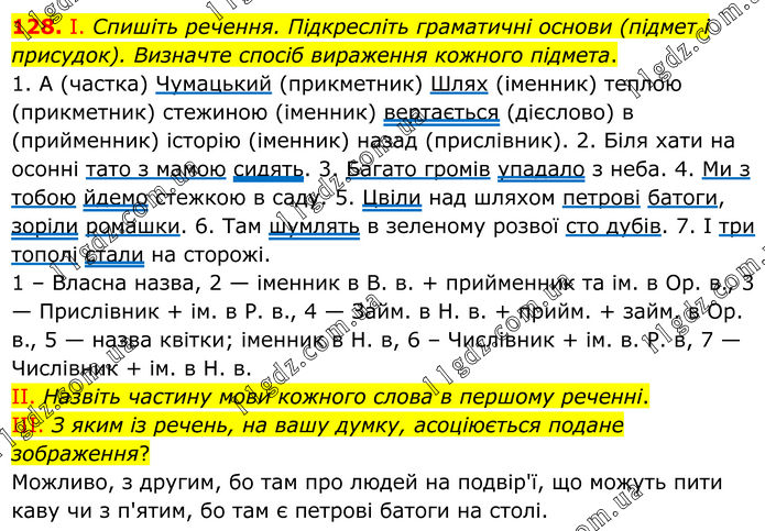 128. І. Спишіть речення. Підкресліть граматичні основи (підмет і присудок). Визначте спосіб вираження кожного підмета. 1. А (частка) Чумацький (прикметник) Шлях (іменник) теплою (прикметник) стежиною (іменник) вертається (дієслово) в (прийменник) історію (іменник) назад (прислівник). 2. Біля хати на осонні тато з мамою сидять. 3. Багато громів упадало з неба. 4. Ми з тобою йдемо стежкою в саду. 5. Цвіли над шляхом петрові батоги, зоріли ромашки. 6. Там шумлять в зеленому розвої сто дубів. 7. І три тополі стали на сторожі. 1 – Власна назва, 2 — іменник в В. в. + прийменник та ім. в Ор. в., 3 — Прислівник + ім. в Р. в., 4 — Займ. в Н. в. + прийм. + займ. в Ор. в., 5 — назва квітки; іменник в Н. в, 6 – Числівник + ім. в. Р. в, 7 — Числівник + ім. в Н. в. II. Назвіть частину мови кожного слова в першому реченні. III. З яким із речень, на вашу думку, асоціюється подане зображення? Можливо, з другим, бо там про людей на подвір'ї, що можуть пити каву чи з п'ятим, бо там є петрові батоги на столі.